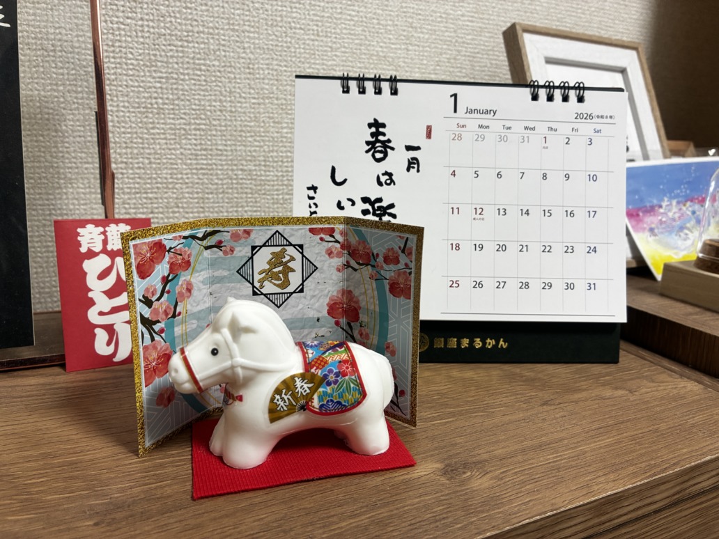 ※写真の手前のお馬さんが干支石鹸。奥のカレンダーが卓上カレンダーです。
